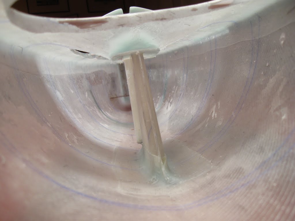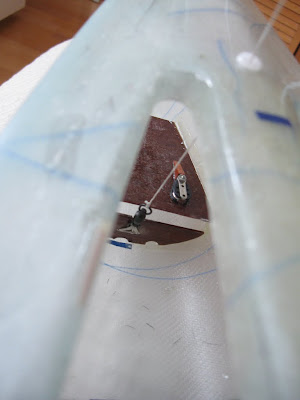 Supporting beams give extra strength to the fin box. The frame-timber is 0,8 mm mahogany coated on both sides with glassfiber. The result should be extra strength at minimal weight costs.